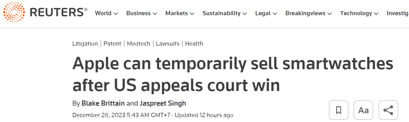 Apple shares rose 0.3% premarket as the International Trade Commission ITC temporarily halts ban on selling Apple Watch models.