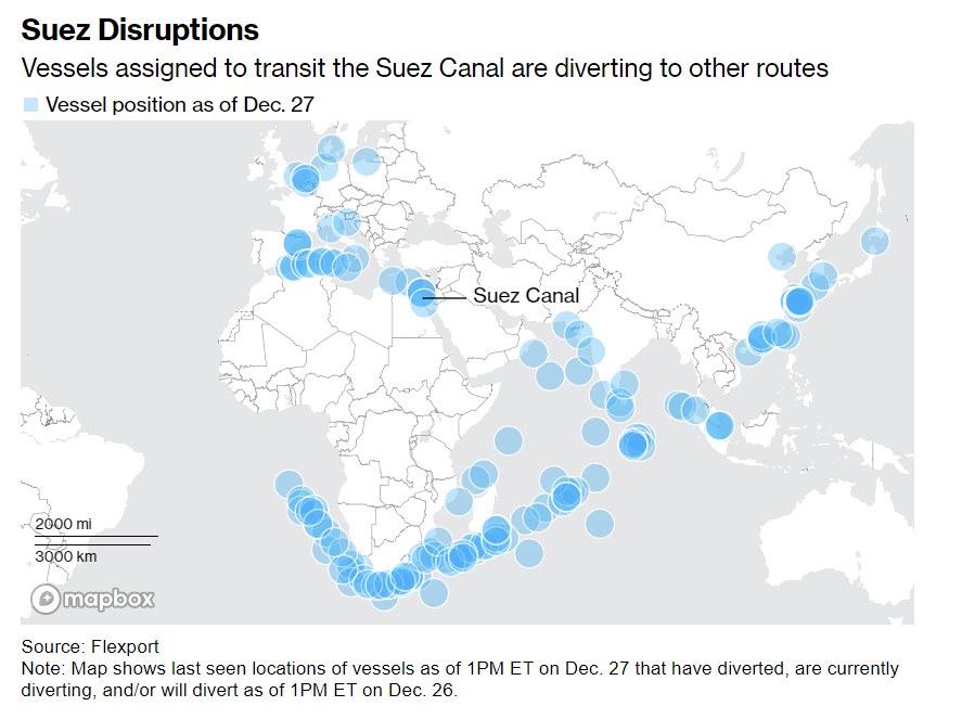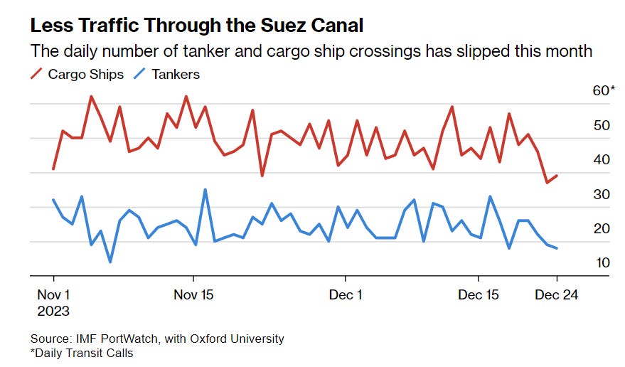 Half of container ships in the Red Sea have rerouted after attacks, causing Suez Canal traffic frequency to continue declining: