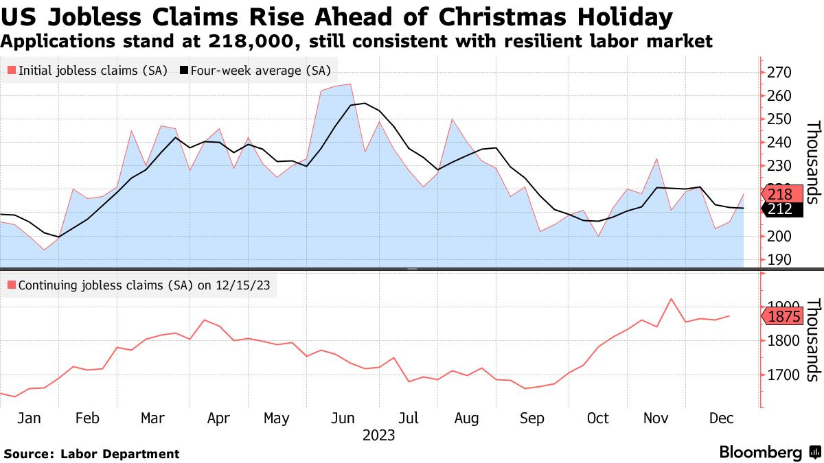 Initial jobless claims for the week before Christmas increased +12,000 to 218,000, higher than expected but still near historic lows.