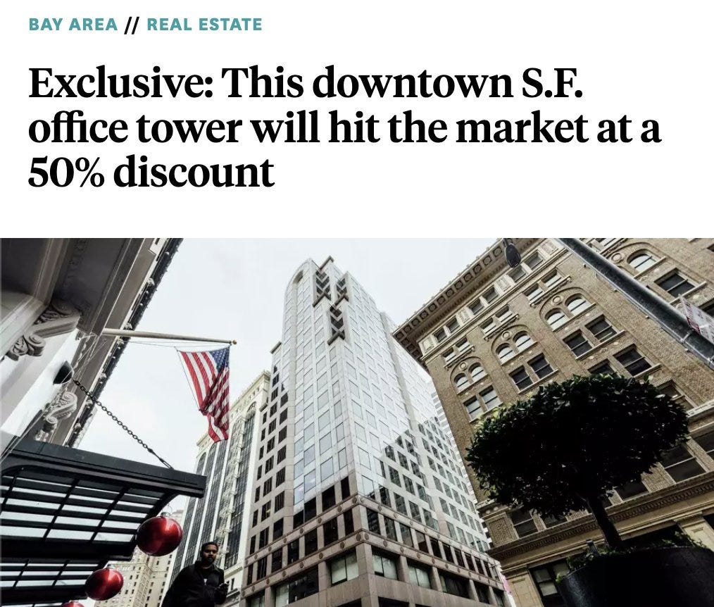 Office building prices have fallen more than 30% this year. A 20-story office building in downtown San Francisco was sold for 148 million USD in 2014, but is now listed at only 80 million USD (down 46%).