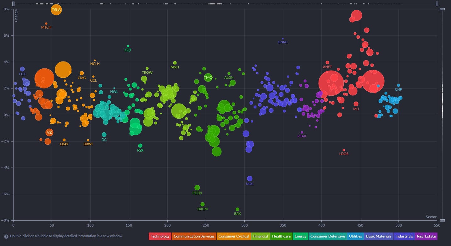 The market continues Friday's strength in the first trading session of the week with most NASDAQ components bought in the morning, pulling SPY up from the 390 area right at the open and continuing to run to near 394 before meeting resistance amid a strong mega-cap tech rally on the back of bonds yield dropping quite deeply since Thursday last week.