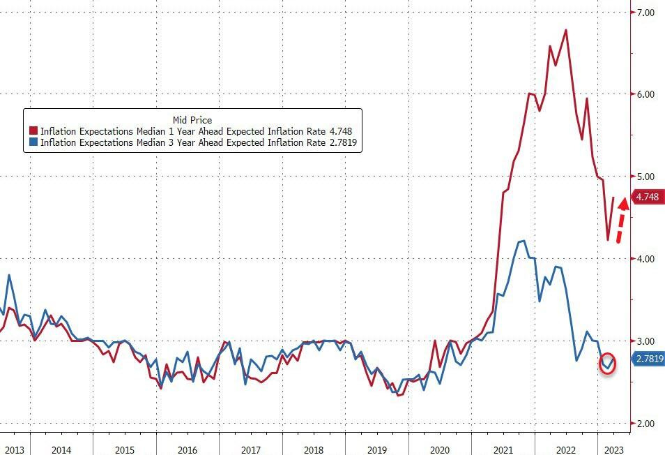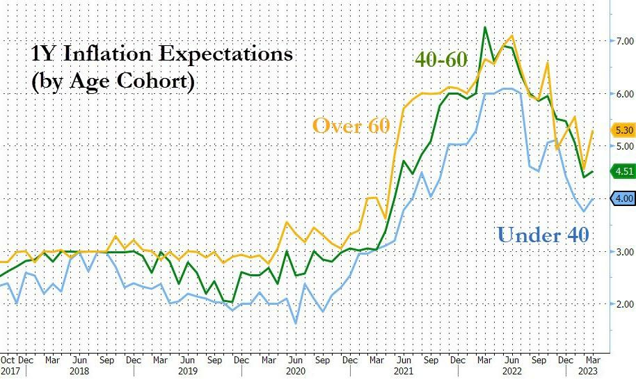 On the macro front, the FED survey shows that public inflation expectations continued to rise again in March, with inflation over the next year returning to nearly 5%: