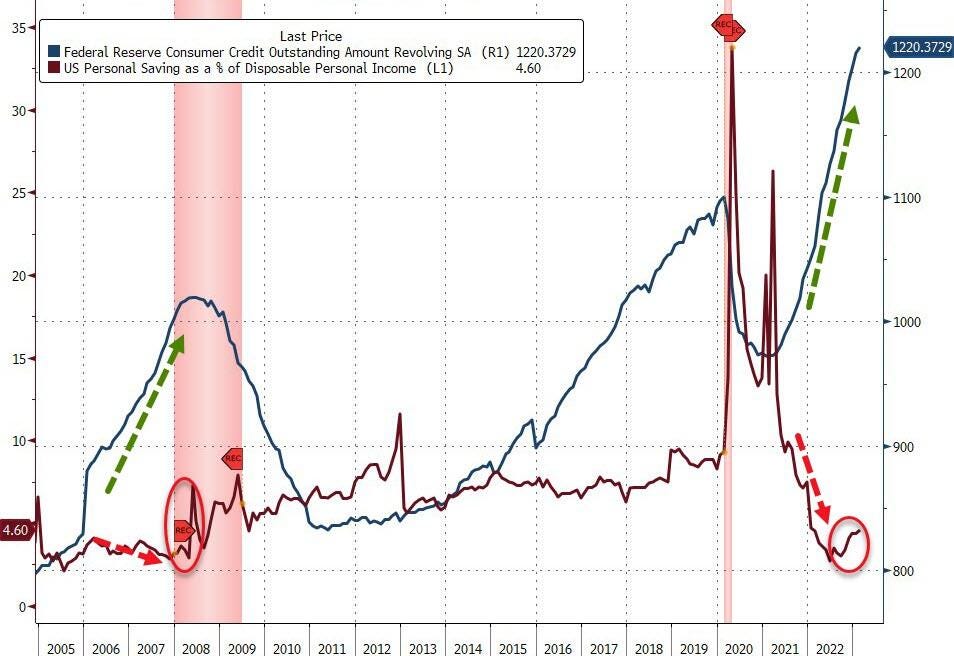 Notably here, although total household debt continues to rise, the savings rate has also increased again. This occurred similarly right before the GFC in 2008, indicating a change in consumer sentiment as consumers begin to perceive financial risks and cut back on spending habits, leading to a drop in demand and igniting a recession.