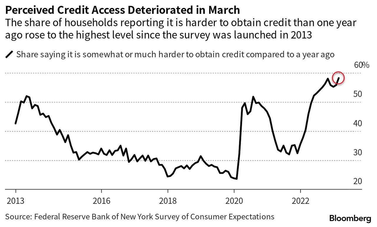 With the banking sector continuing to face a deposit crisis, lending conditions continue to tighten across the economy. Nearly 60% of households say accessing loans is harder than a year ago: