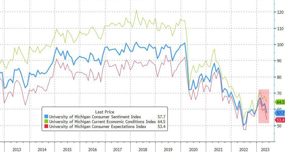 Consumer confidence index drops to 57.7, lowest since November, showing continued pressure on consumers