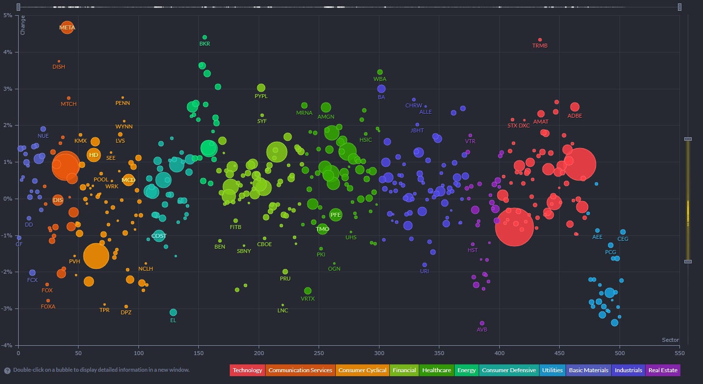 Market opens the first trading session of the week on extremely low volume with energy and financial carrying the market. Tesla continues to be affected by volatility after the Twitter acquisition deal while Meta surges 5% after announcing plans to cut thousands of jobs to reduce costs. On the heatmap, money flow generally moves quite evenly across both mid and large cap with most investors deciding to sit out the market 1 day before the midterm election.