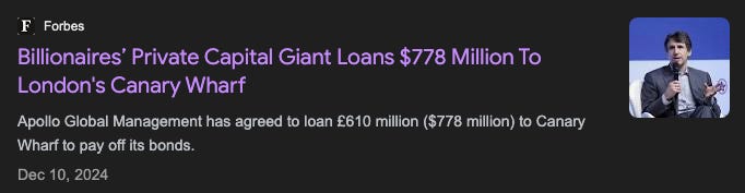 But then Apollo stepped in. A loan package worth hundreds of millions of pounds was disbursed, with interest rates double the old coupon. No one called this a “free bailout”. It was emergency oxygen tank – expensive, but enough for Canary Wharf to breathe for a few more years.