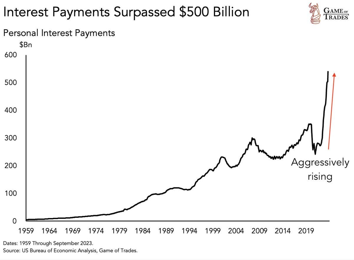 Interest payments on US personal debt have now reached USD 500 billion - an unprecedented figure in history.