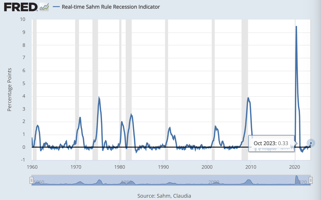 The Sahm recession indicator surged from +0.2% (September) to +0.33% in October 2023.