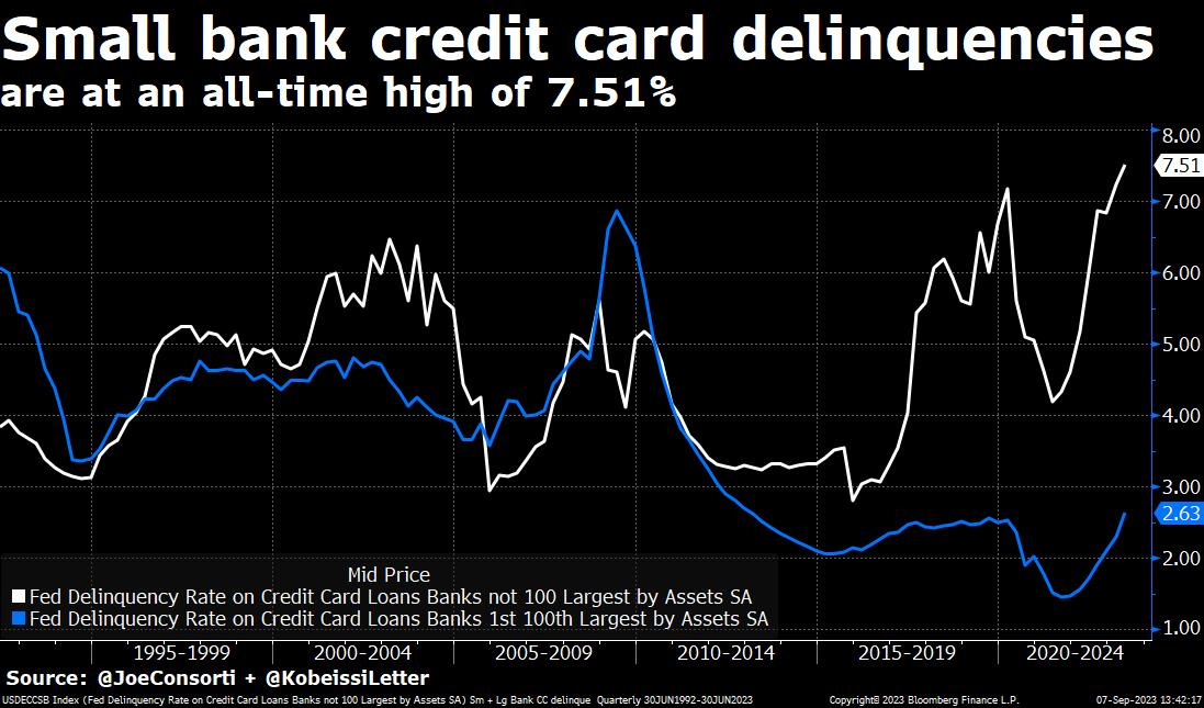 Particularly, the credit card delinquency rate at small banks (group of banks with concentration risk on consumer credit debt) is at 7.51% - the highest level ever.