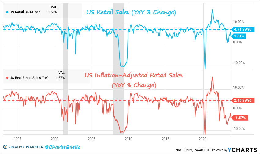 US real retail sales (inflation-adjusted) fell -1.6% y/y, the 12-month y/y decline, also the longest decline streak since the 2008-09 season.