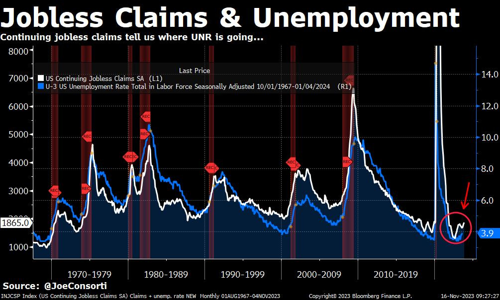 Last week, continuing jobless claims rose to the highest level since 2021.