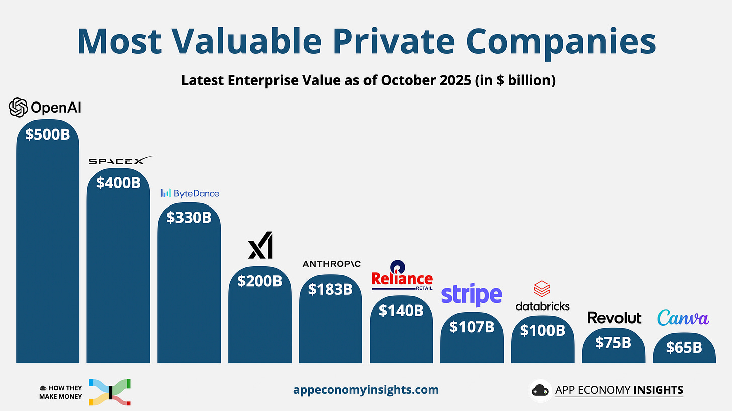 In October 2025, OpenAI reaches $500 billion valuation, surpassing SpaceX and ByteDance, becoming the world's most valuable private company.