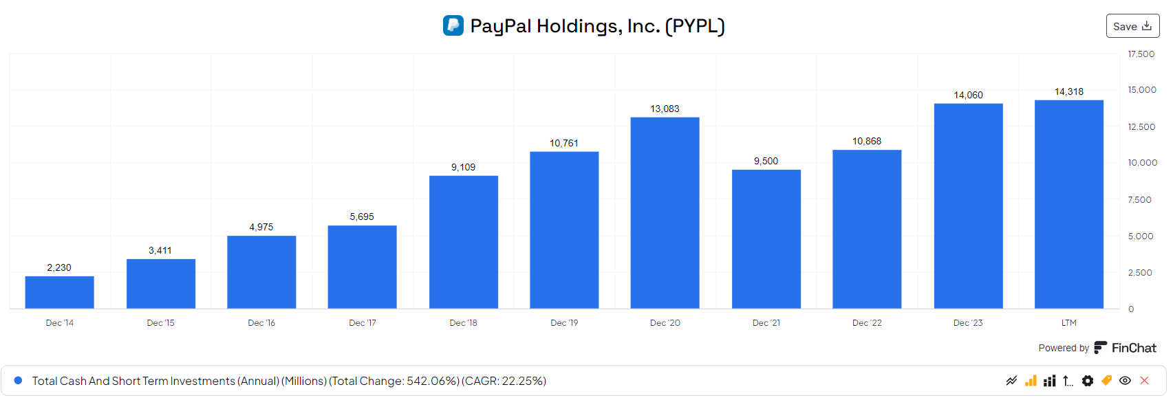 PayPal is in a very strong financial position with cash and cash equivalents trending upward continuously except for 2021.