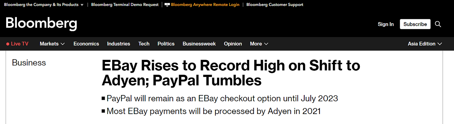 PayPal once enjoyed a close relationship with its parent company eBay, but this e-commerce giant replaced PayPal with Adyen, becoming the preferred payment platform during the 5-year transition from 2018 to 2023.