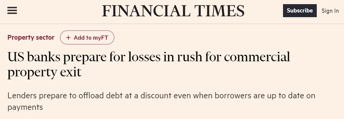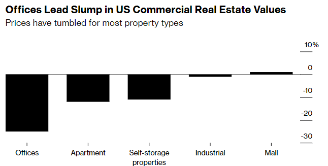 According to Green Street, commercial real estate prices have fallen since the Fed raised rates: now down -21% from the peak at the beginning of 2022.