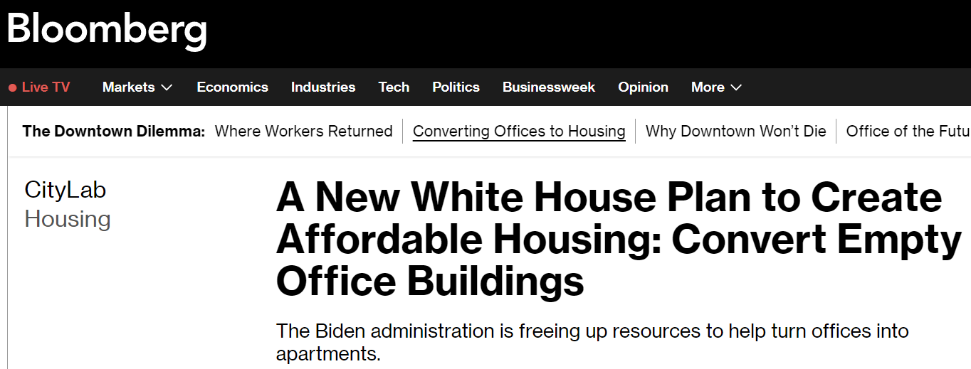 Biden encourages developers to convert empty office buildings into apartments to mitigate the housing supply shortage.