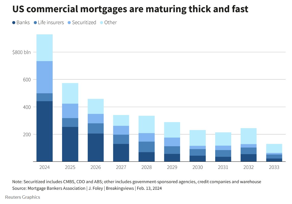 According to MBA, borrowers will have to repay 929 billion USD for CRE loans in 2024 (accounting for 1/5 of total debt) and 573 billion USD in 2025.