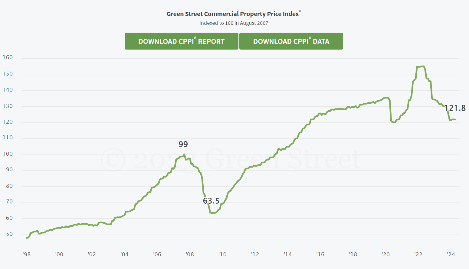 According to Green Street, the commercial real estate market is experiencing the worst 4 years of stagnation ever, with office vacancy area since 2019 surpassing both the dot-com bubble period and the global financial crisis.