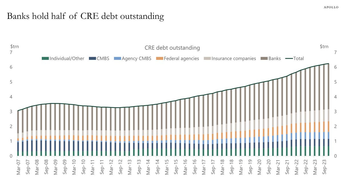 Currently, there is approximately 6 trillion USD in CRE debt, of which banks hold up to 3 trillion USD, equivalent to 50% of total debt.
