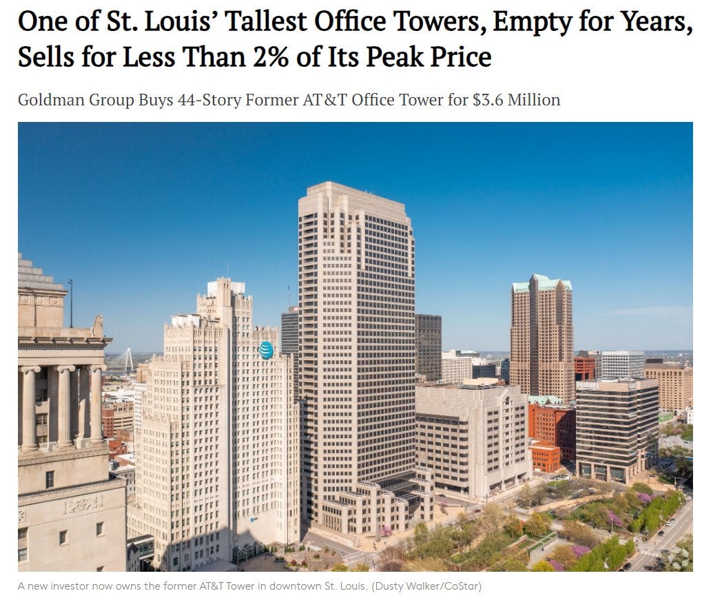 Most recently, AT&T's old building in St. Louis was just sold for 3.6 million USD, losing more than 98% compared to the 205 million USD price in 2006.