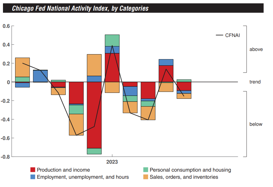 The National Activity Index from Chicago Fed fell in May to -0.15 (from a favorable +0.14 in April/2023).