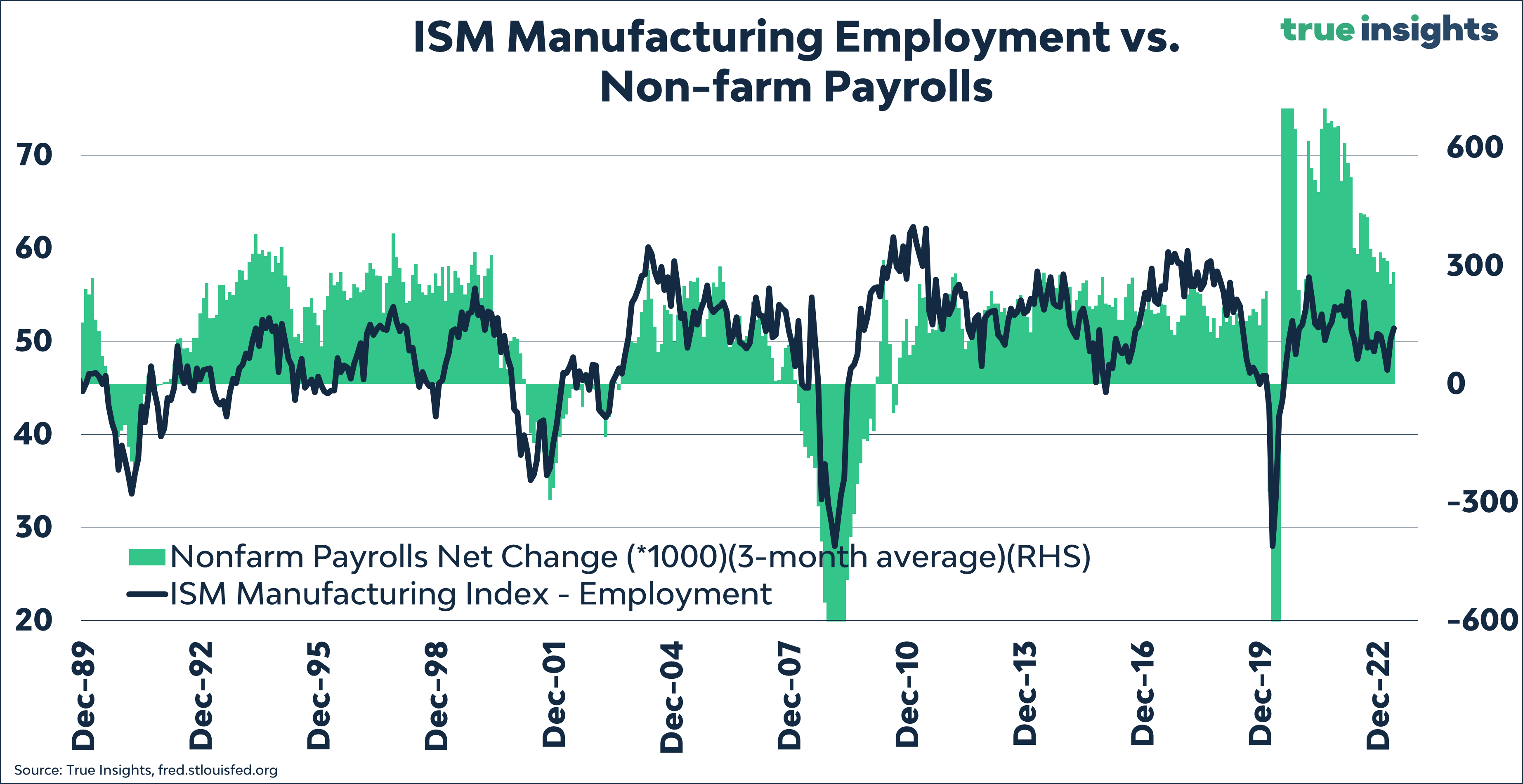 Payroll numbers still rising high (light green) while hiring activity in manufacturing firms remains brisk - still increasing from the end of last year (black chart line).