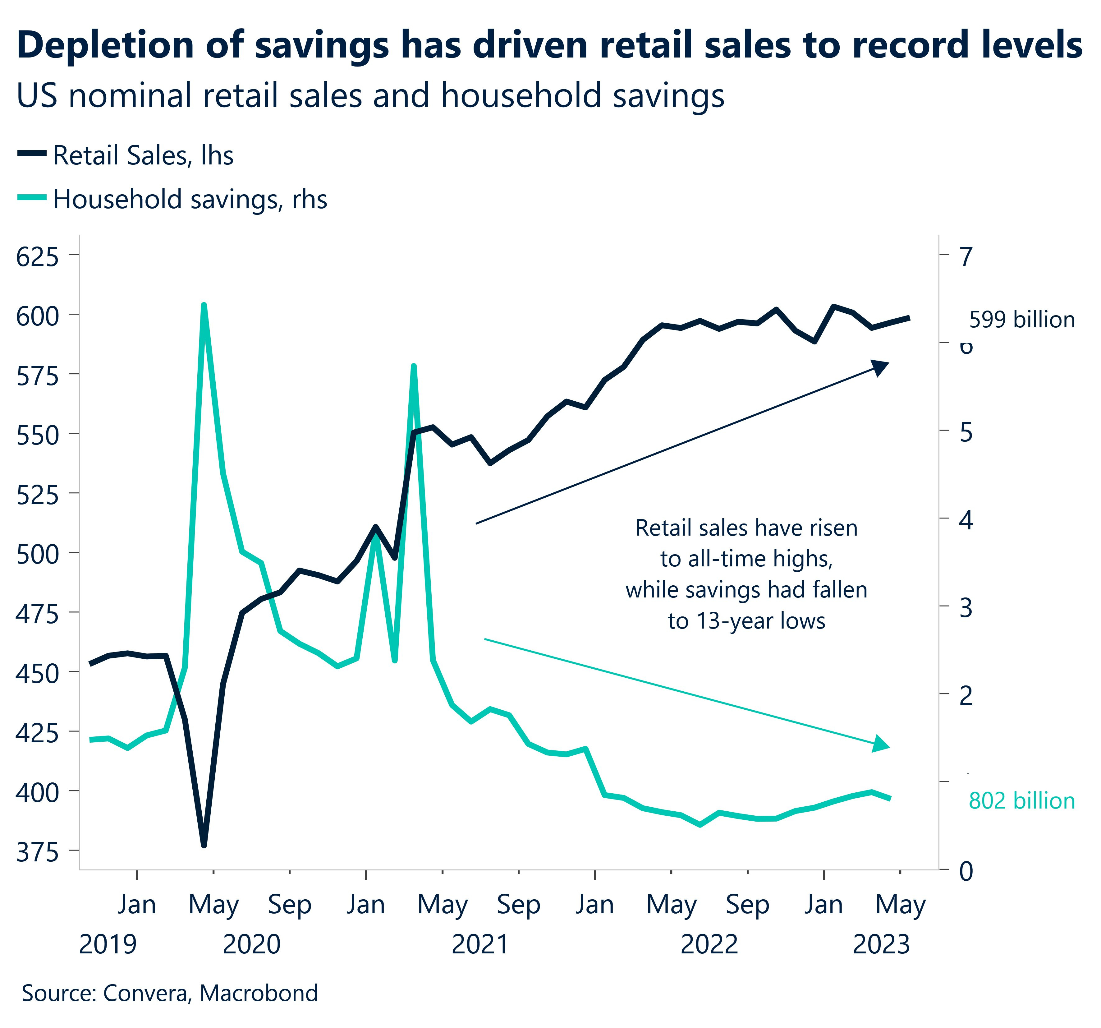 Currently, total US household savings has fallen back below < USD 1000 billion, signaling spending will slow in the second half of 2023.