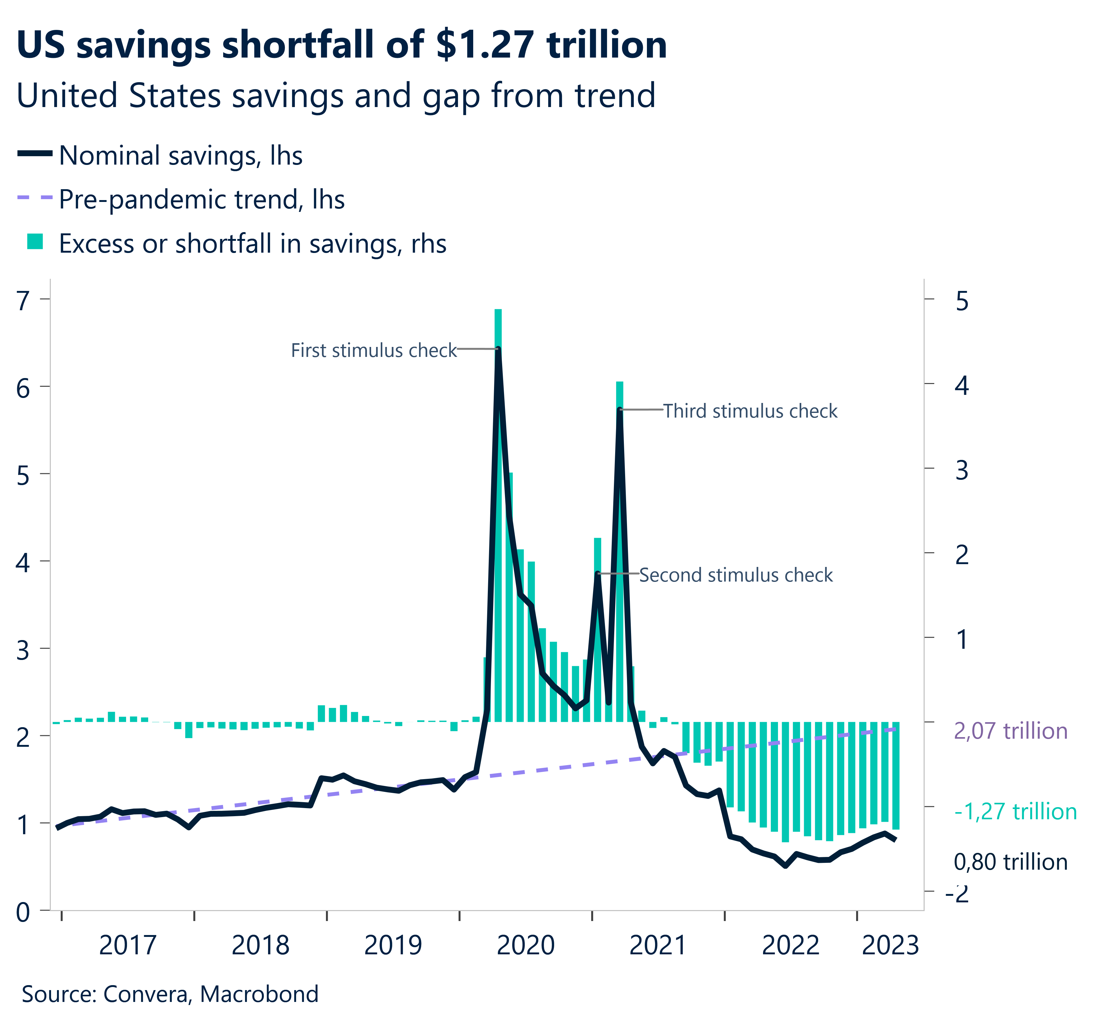 Meanwhile, US household savings is much lower than the pre-pandemic trend forecast: