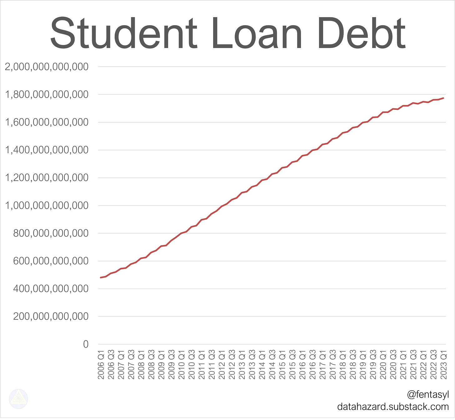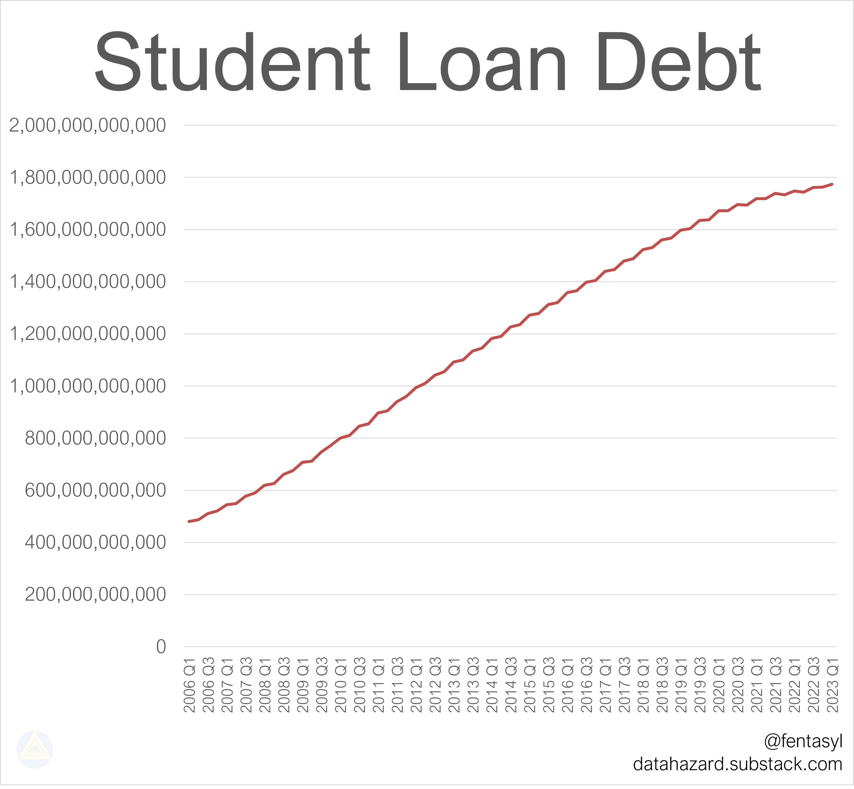 Total student debt has reached ~USD 1.8 trillion, accounting for about 10% of the US national debt.
