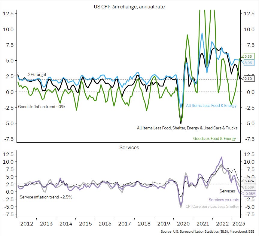 Especially core CPI for goods is trending upward again (light green chart line) while core CPI for services has slowed.