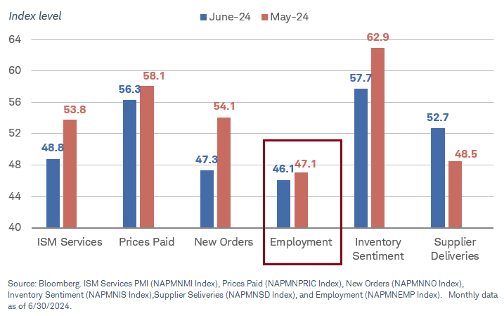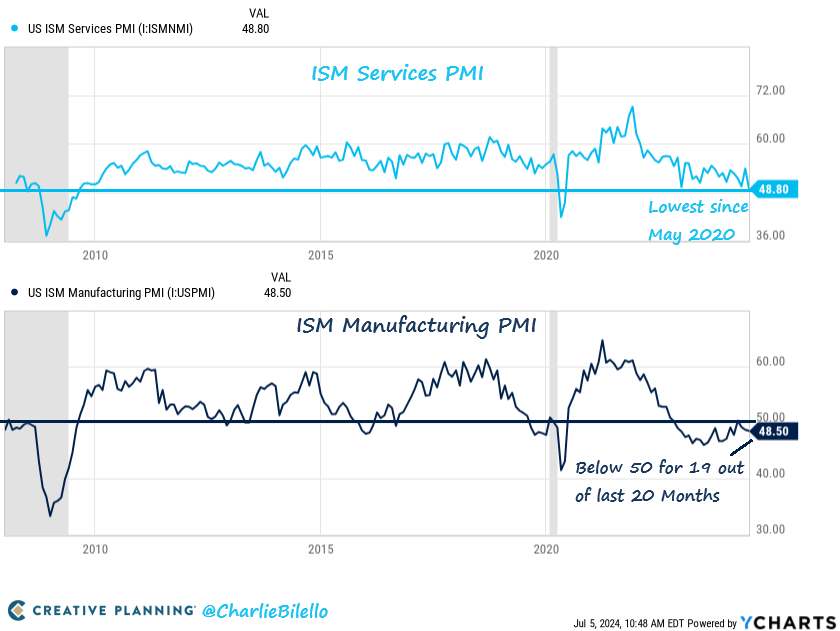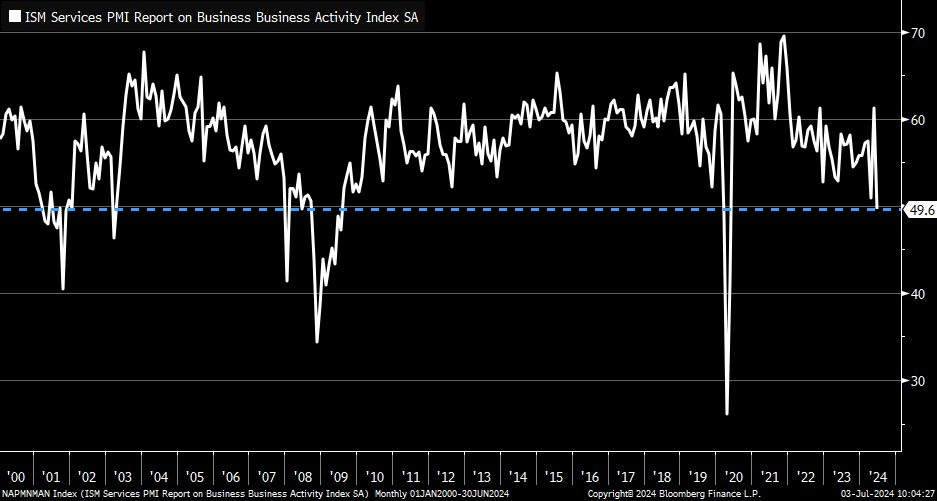 Services PMI has followed the trend of Manufacturing PMI (ISM): dropping below the 50 threshold (contraction threshold) in May.