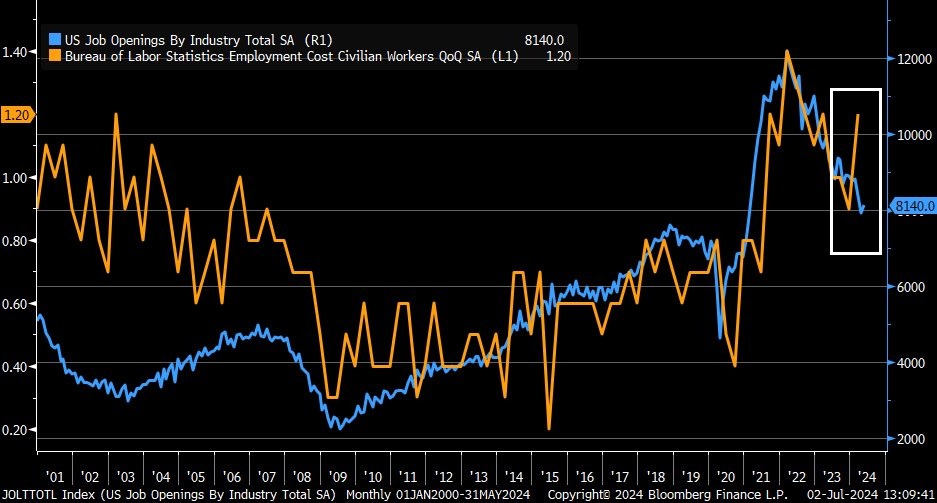 Usually: Number of job openings by businesses (job openings) gradually decreasing is usually accompanied by Labor costs also decreasing accordingly.
