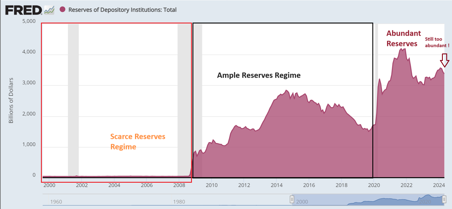 Banks' cash reserves at the Fed: although significantly reduced since the Fed implemented QT, still much higher than pre-Covid levels.