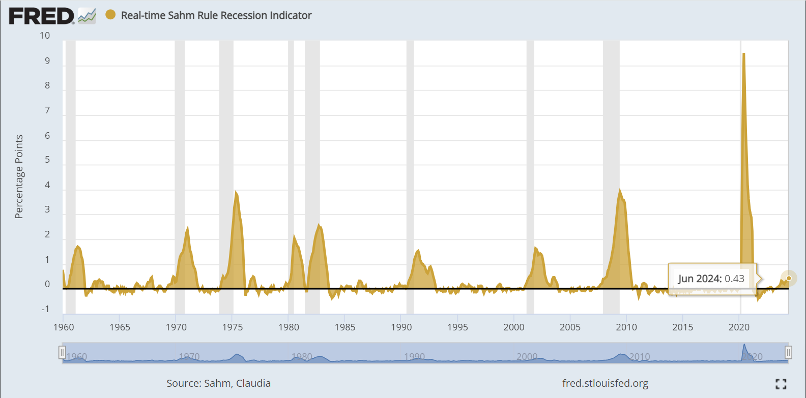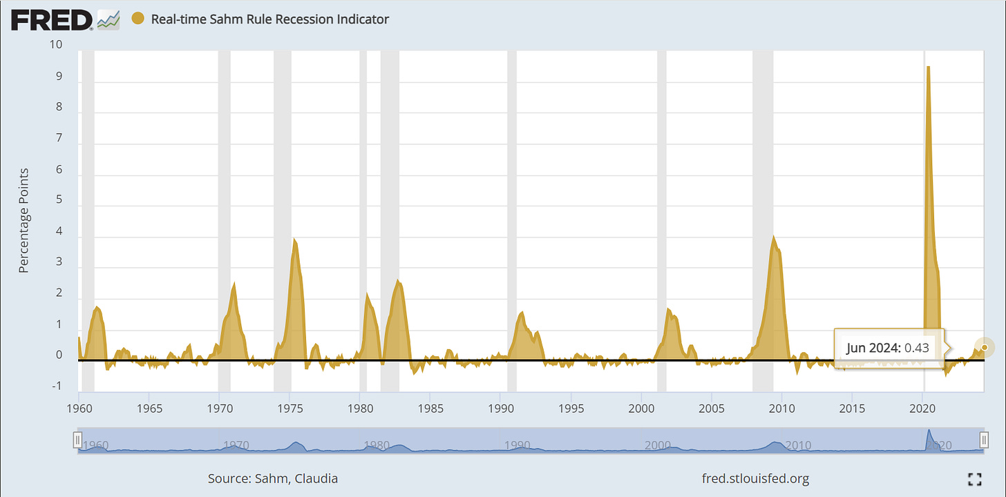 With June unemployment rate at 4.1%, the Sahm Rule recession indicator has risen to the threshold 0.43% — very close to the recession alert level (0.5%)