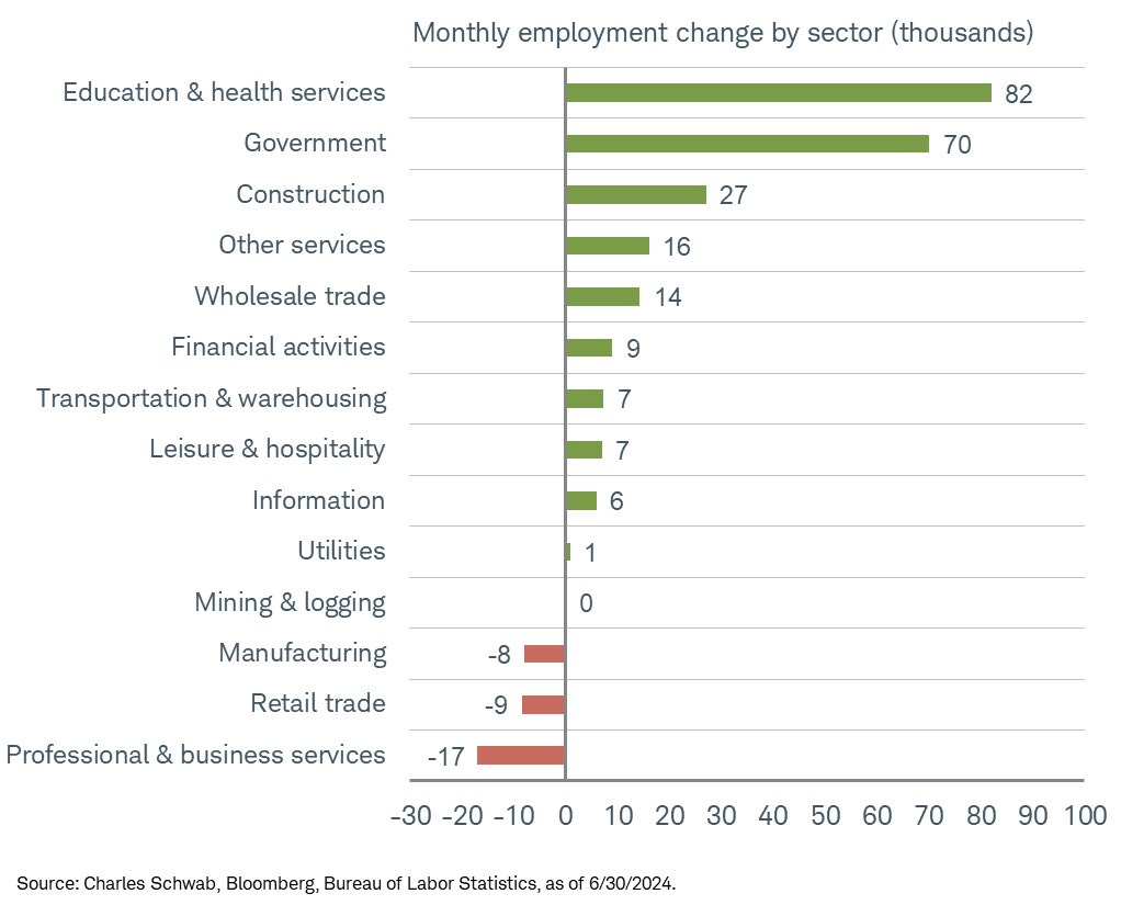Over ⅔ of new jobs created in June come from the government sector (government) and government-subsidized social welfare services (healthcare and education):