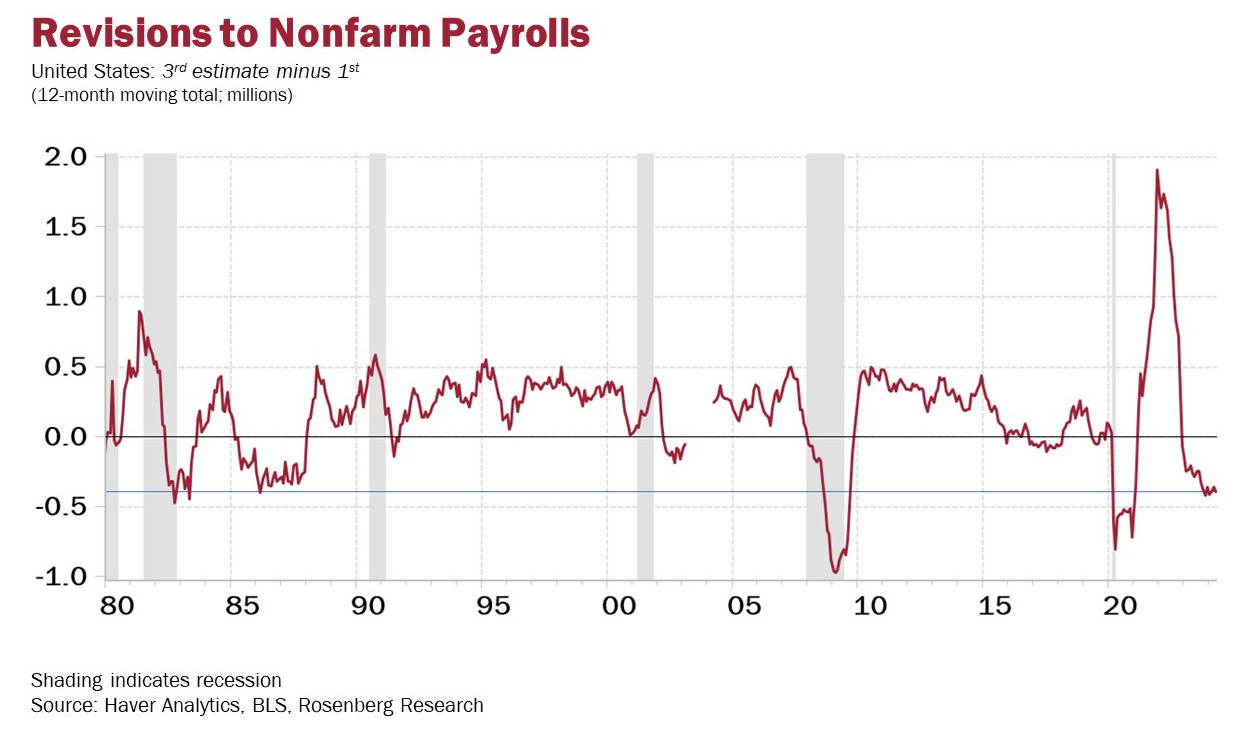 Downward revision -111,000 jobs for April-May/2024 exacerbates the total downward revision of payrolls in the most recent 12 months…