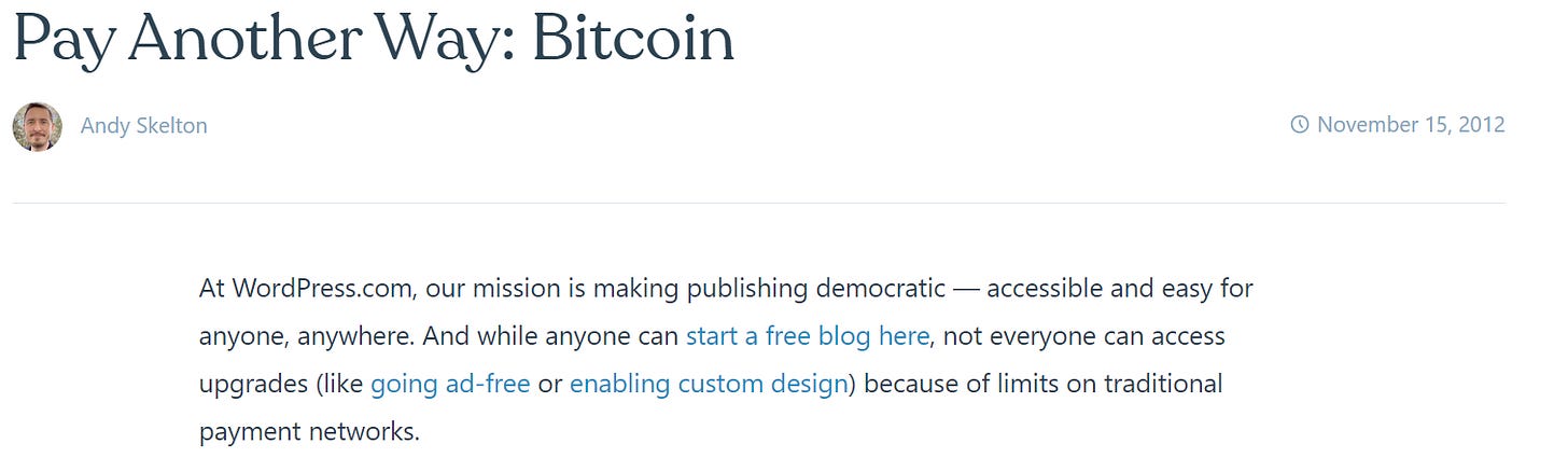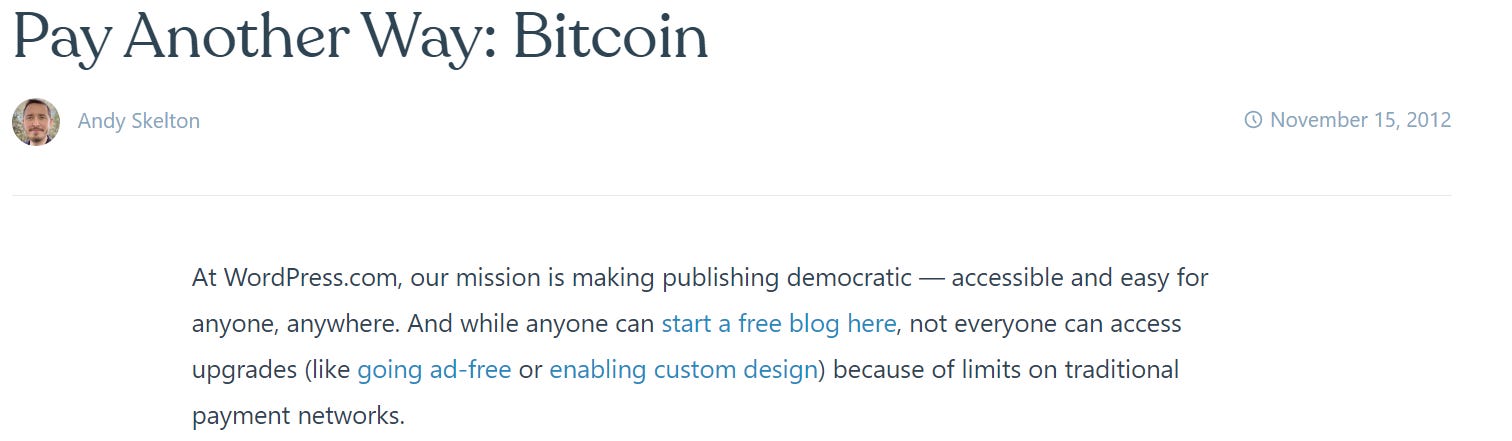 End of 2012: WordPress was the first major retailer to accept Bitcoin payments.