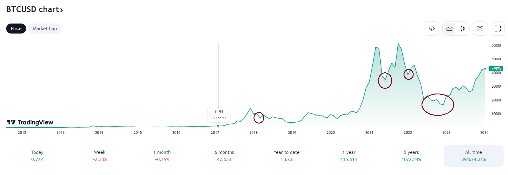 With increasing public interest, Bitcoin's value broke through more and more after 2017 (although the value fluctuated quite erratically with 4 extreme drops in value).