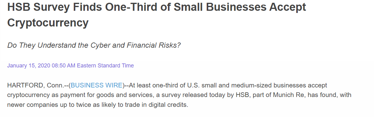 A 2020 HSB survey showed: 36% of small and medium-sized businesses in the US accept Bitcoin payments.