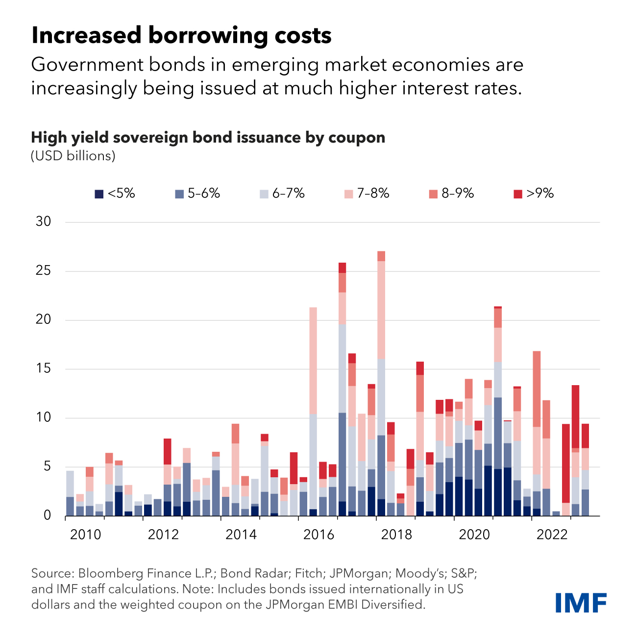 Since late 2022 to 2023 (when Fed raised rates), more emerging country governments have had to borrow at rates >9% (red column in the image below).