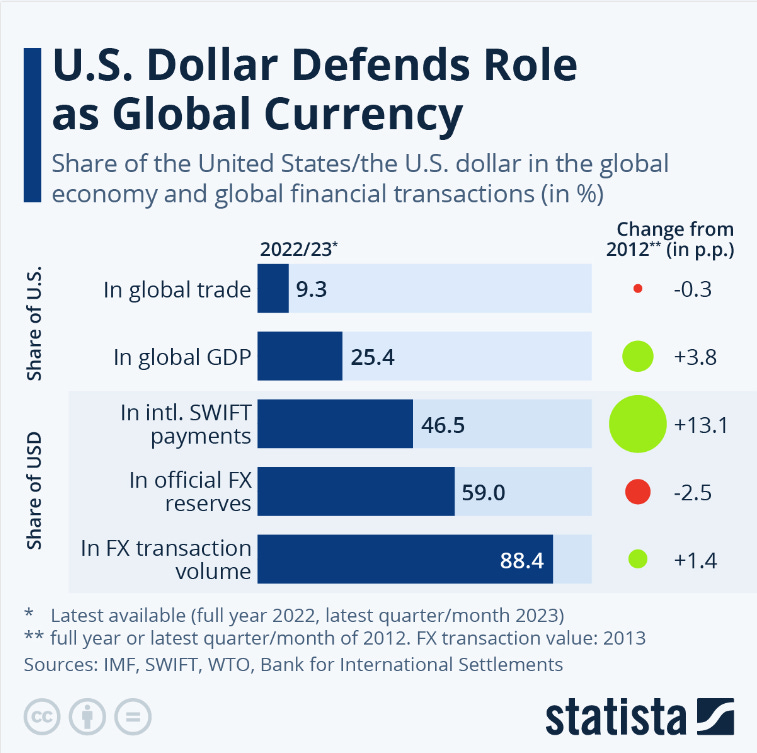 The Dollar currently still holds the role of the world's primary currency: accounting for 88% of forex transactions, 59% of currency reserves, and 46.5% of international payments (SWIFT).