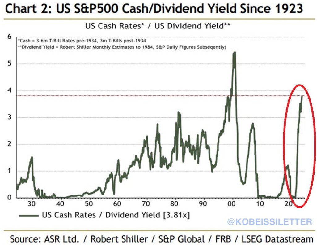 T-bill yields: the world's safest financial asset (safe haven) has surged and is now 381% higher than the dividend yield of the S&P500 basket.