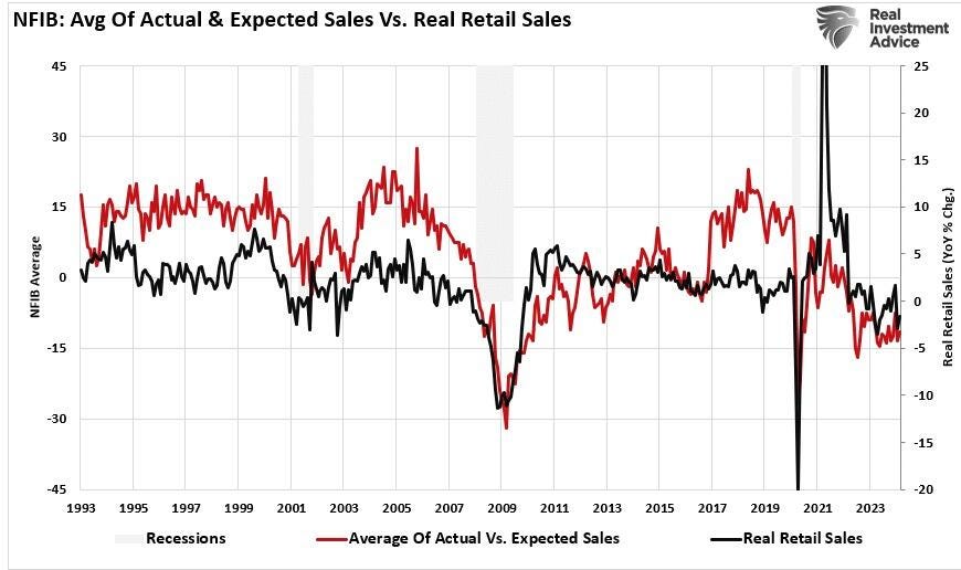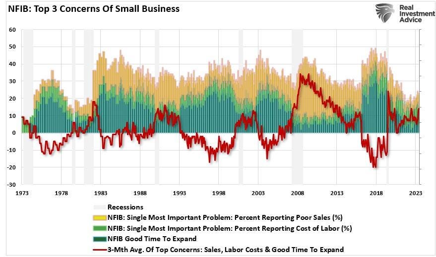 However, in reality, one of the concerns of small businesses according to the NFIB survey is declining sales issue (yellow column):