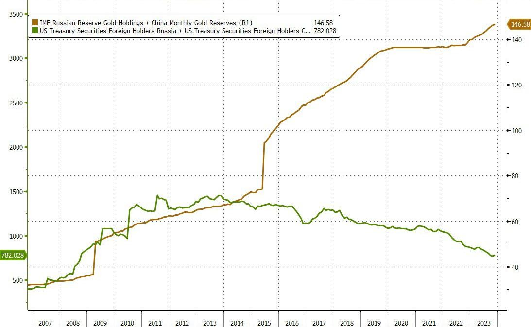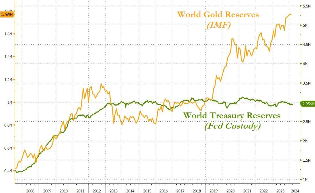 And not just China, global gold reserves are also increasing day by day, while the amount of US T-bond held by international organizations remains flat.