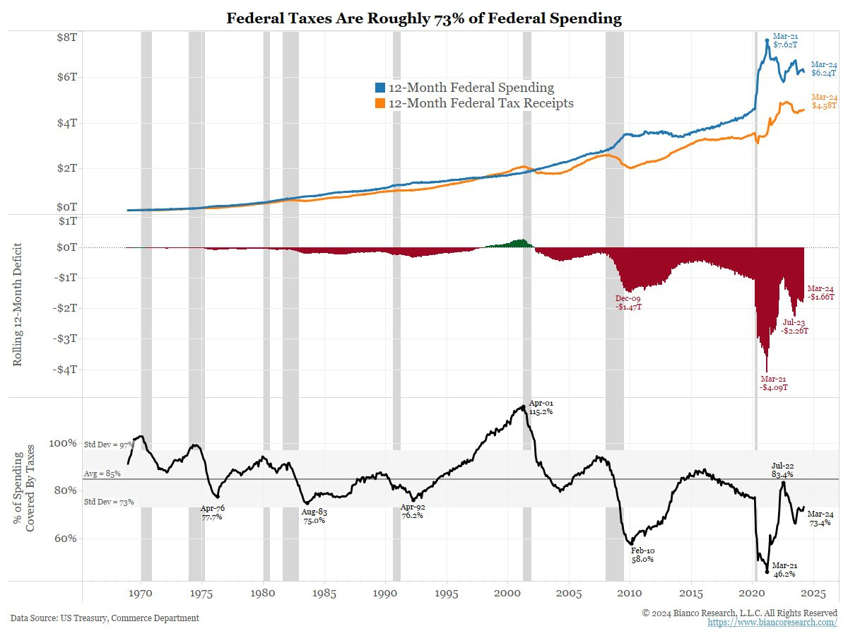 Tax revenue in April was only enough to cover about 73% of federal government spending.