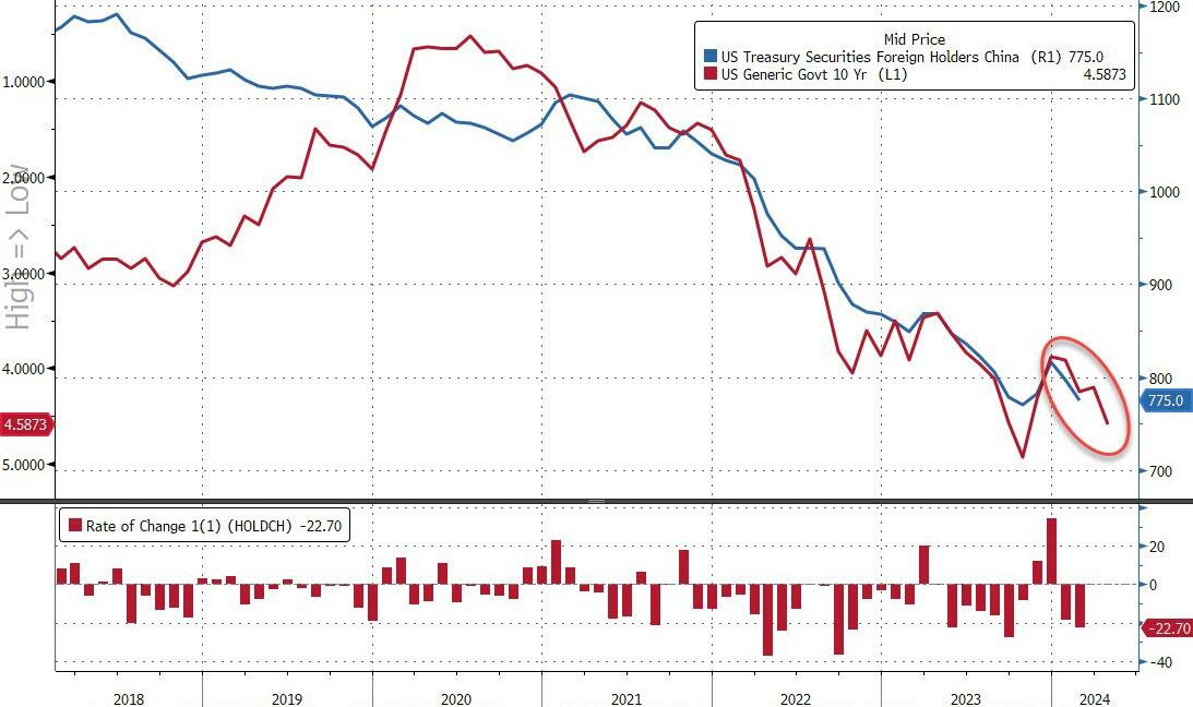 Although it's just an uncertain correlation, China's reduction in holdings of US Treasury bonds over the years coincidentally coincides with the trend of rising yields on the benchmark 10Y T-bond.