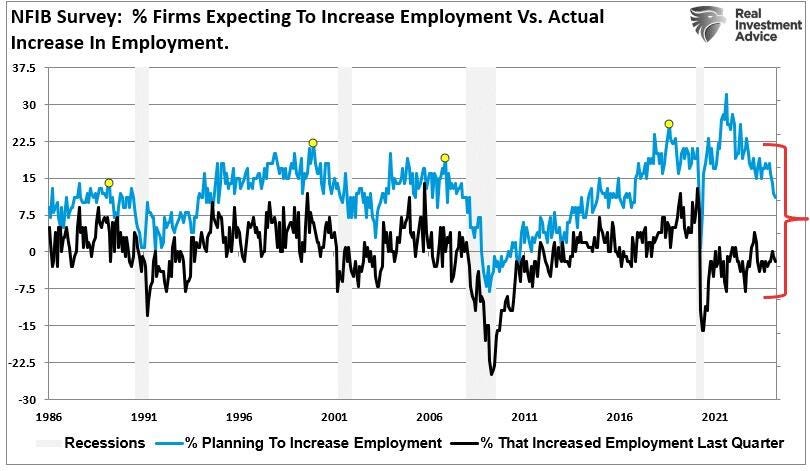 But reality shows their hiring activity is much lower than initial plans (black line):