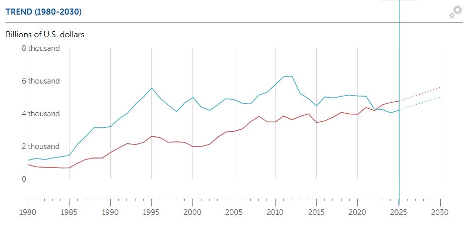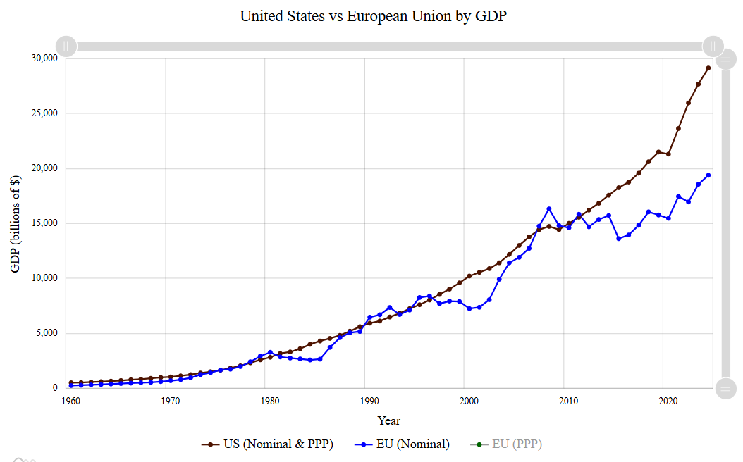 After nearly 2 decades of stagnation, Europe has fallen quite far behind the US in total economic output.