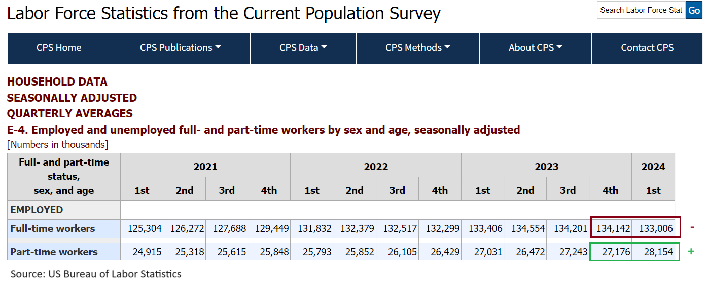 Number of part-time jobs increased +978,000 — while number of full-time jobs decreased -1.136 million jobs in Q1/2024: